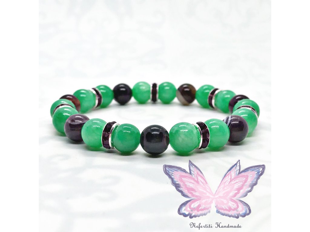 Tento stylový náramek kombinuje zelený jadeit, kámen spojený s klidem, ochranou a vnitřní harmonií, s černým achátem, který je symbolem stability, odvahy a uzemnění. Společně vytvářejí vyvážený šperk, který nejen zdobí, ale také podporuje rovnováhu těla i mysli. Lesklé minerální korálky doplněné elegantními kovovými prvky dodávají náramku moderní vzhled. Hodí se pro každodenní nošení i jako originální dárek s hlubokou symbolikou.